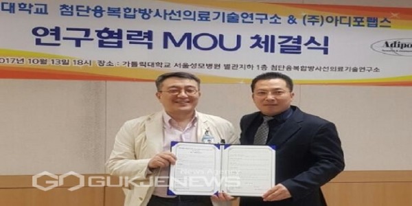이날 가톨릭대학교 서울성모병원에서 열린 체결식에는 첨단융복합방사선의료기술연구소 소장인 방사선종양학과 장홍석 교수와 (주)아디포랩스 한성호 대표가 참석해 협약에 서명했다.