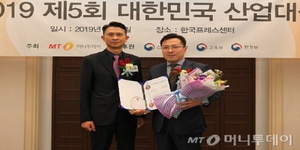 | 이현구 네오픽스코리아 대표(사진 오른쪽)가 '품질대상 3년 연속상'을 받고 박종면 머니투데이 대표와 기념 촬영 중이다/사진=중기협력팀 오지훈 기자 |